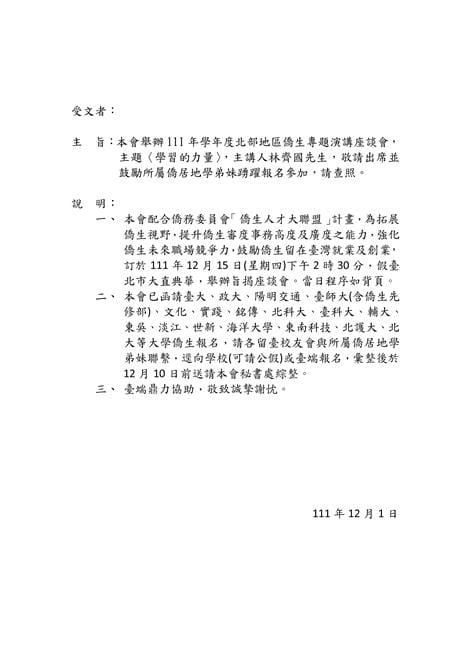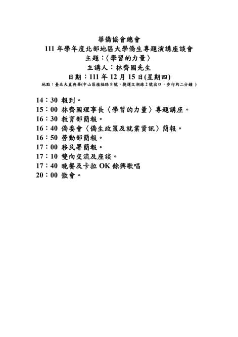 華僑協會 111年學年度 北部地區大學僑生 專題演講座談會
